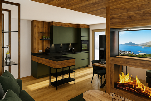 Exclusive alpine styling meets warm atmosphere: reclaimed wood, dark green design accents and a unique water vapor fireplace create unforgettable charm and relaxation. ✨